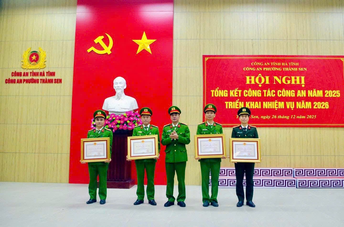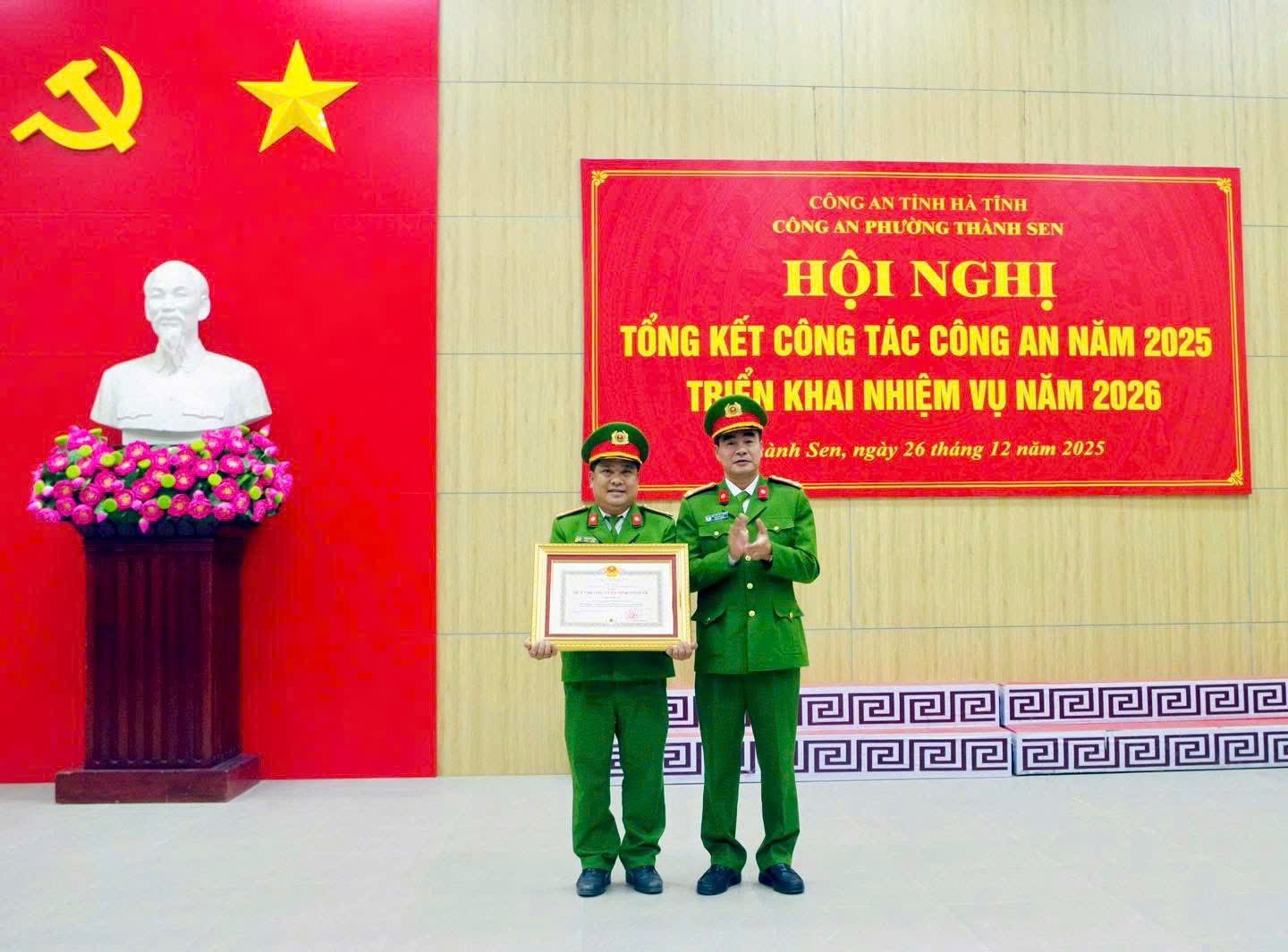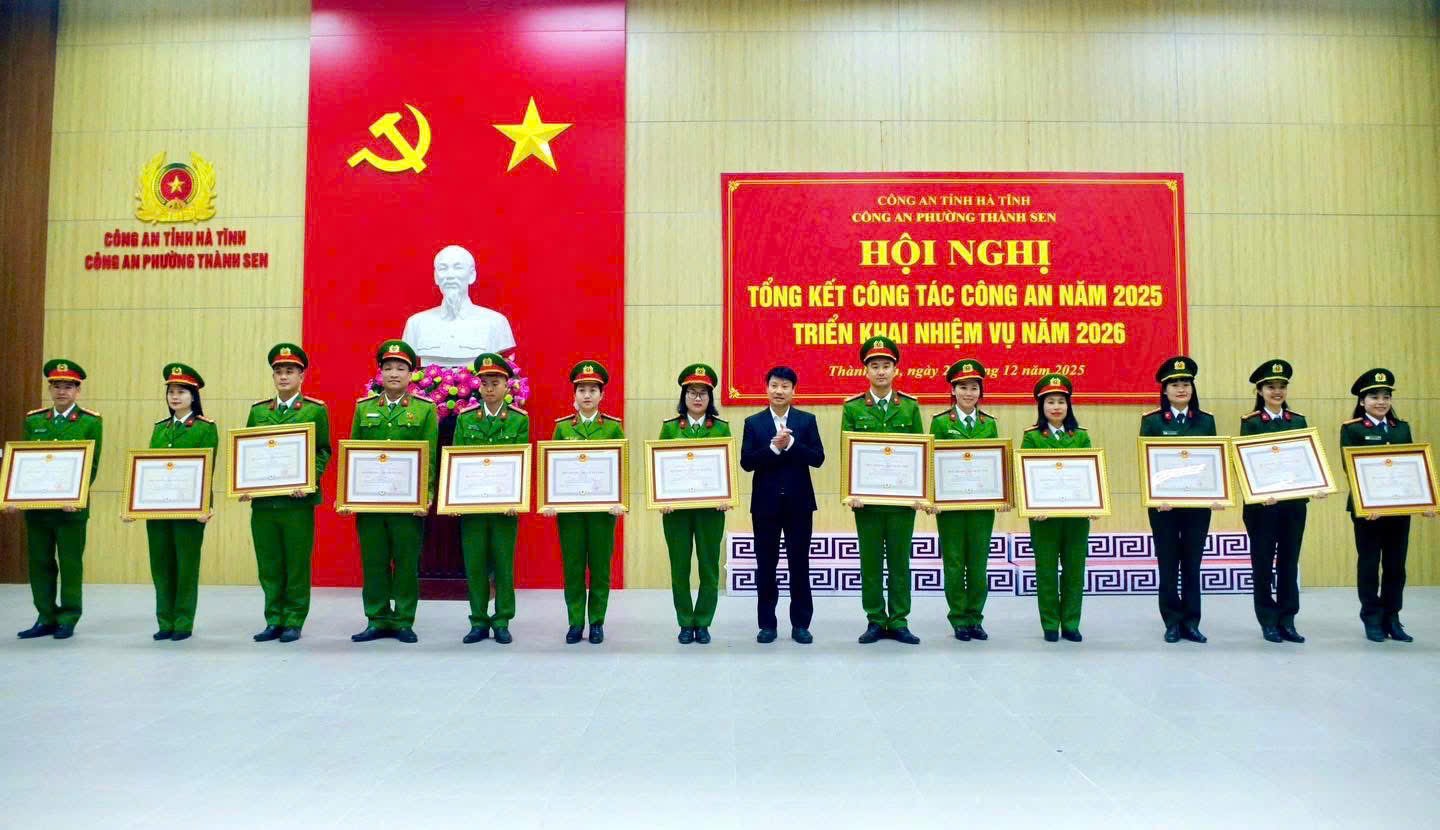 Nhân dịp này, Công an phường Thành Sen đã công bố và trao tặng Huy chương Vì An ninh Tổ quốc, Huy chương Chiến sĩ vẻ vang cho 34 đồng chí; trao tặng danh hiệu Chiến sĩ thi đua cơ sở cho 16 cá nhân có thành tích xuất sắc trong phong trào thi đua “Vì an ninh Tổ quốc” năm 2025.