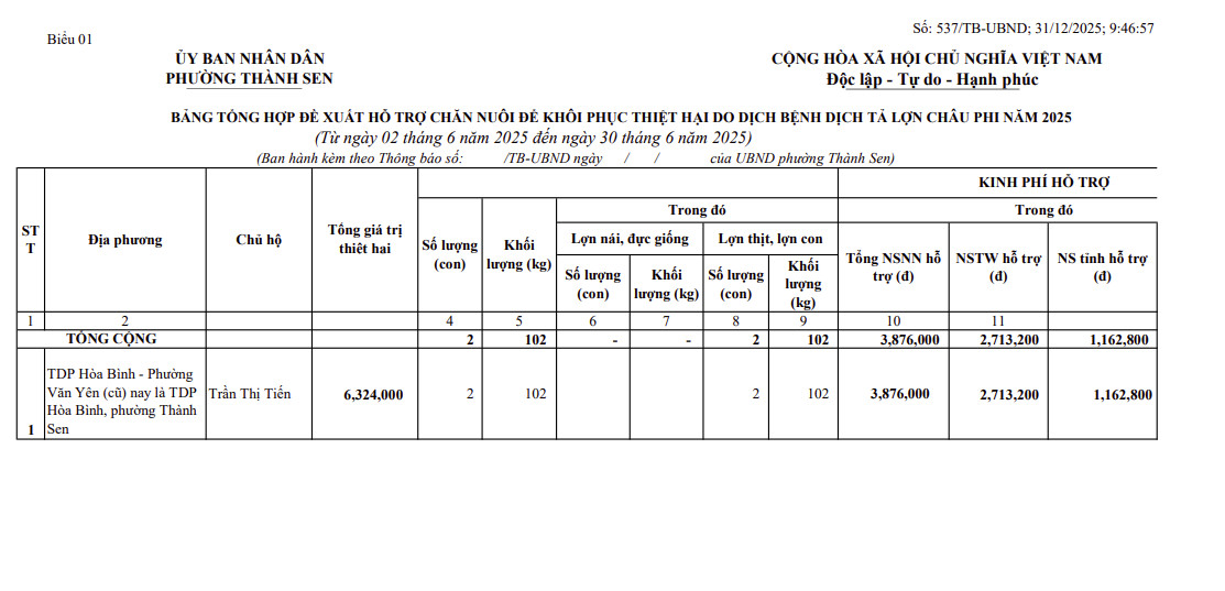 Bảng tổng hợp đề xuất hỗ trợ cơ sở sản xuất bị thiệt hại do dịch bệnh Dịchtả lợn Châu phi trên địa bàn phường Thành Sen trước ngày 30/6/2025.(Có bảng tổng hợp đề xuất hỗ trợ cơ sở sản xuất bị thiệt hại do dịch bệnhDịch tả lợn Châu phi gửi kèm)