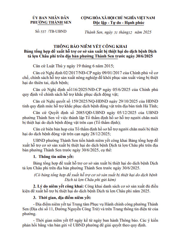 UBND phường Thành Sen tiến hành niêm yết công khai Bảng tổng hợp đề xuất hỗ trợ cơ sở sản xuất bị thiệt hại do dịch bệnh Dịch tả lợn Châu phi trên địa bàn phường Thành Sen trước ngày 30/6/2025, cụ thể: