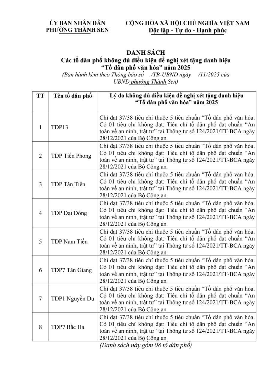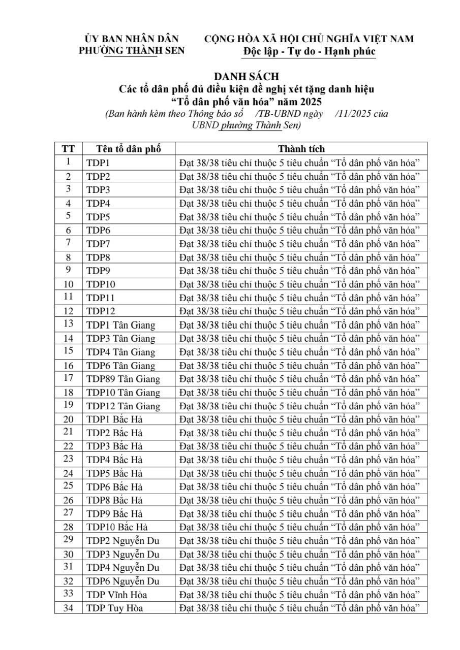 Uỷ ban nhân dân phường Thành Sen thông báo niêm yết công khai danh sách các tổ dân phố đủ điều kiện đề nghị xét tặng danh hiệu “Tổ dân phố văn hóa” năm 2025 và các tổ dân phố không đủ điều kiện đề nghị xét tặng danh hiệu “Tổ dân phố văn hóa” năm 2025