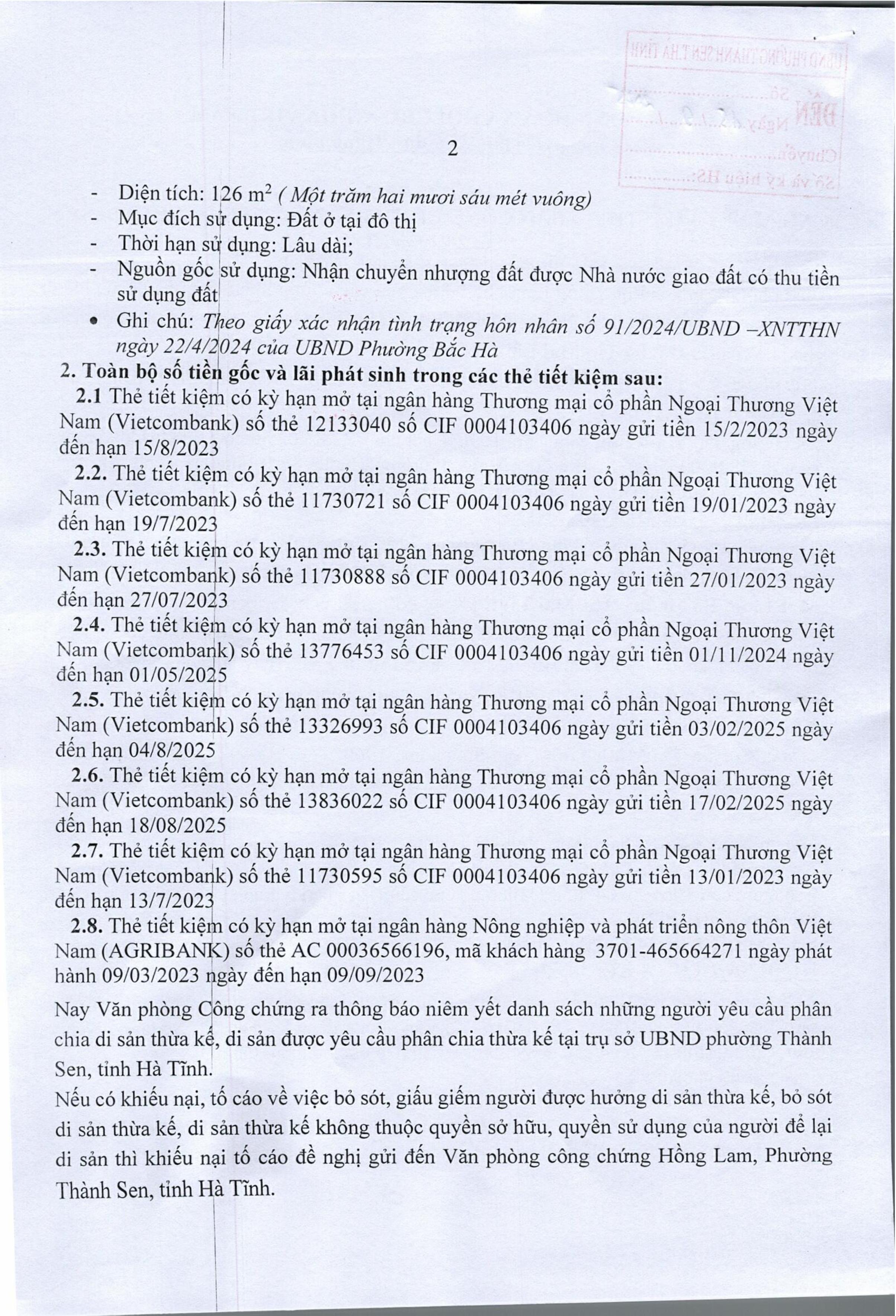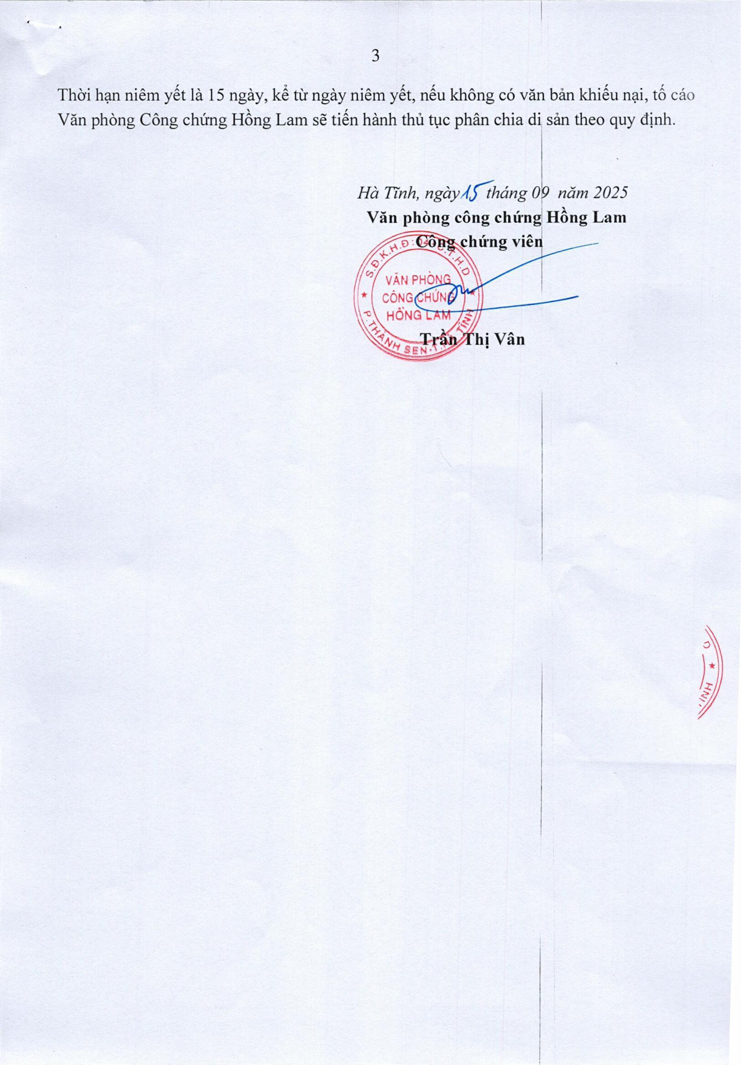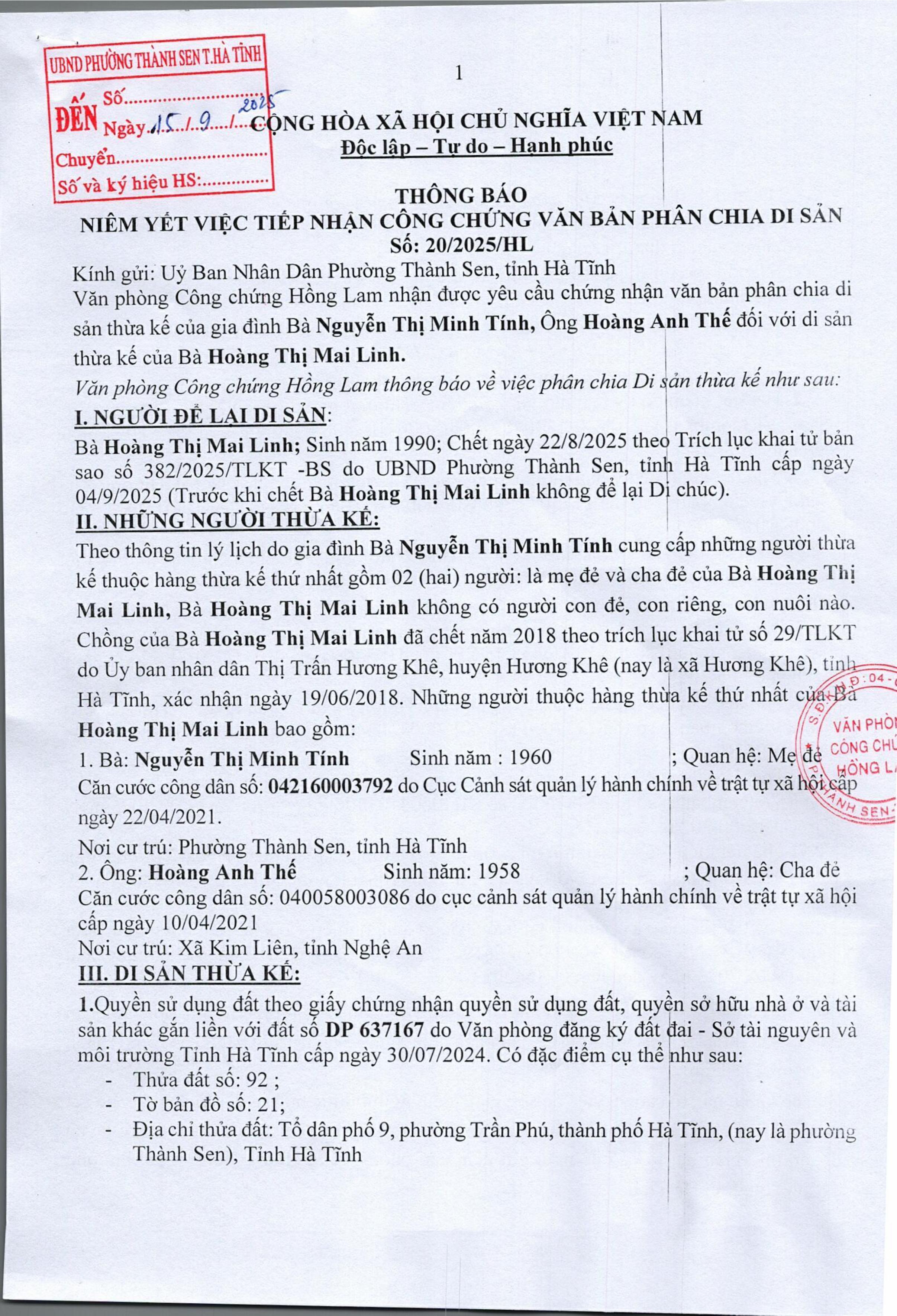 Văn phòng Công chứng Hồng Lam thông báo niêm yết việc tiếp nhận công chứng văn bản phân chia di sản thừa kế (Người để lại di sản: bà Hoàng Thị Mai Linh) Thời gian niêm yết: 15 ngày (kể từ ngày 16/9/2025 đến hết ngày 30/9/2025) Địa điểm niêm yết: Trung tâm Phục vụ hành chính công phường Thành Sen (địa chỉ: số 11 đường Nguyễn Công Trứ, phường Thành Sen, tỉnh Hà Tĩnh)