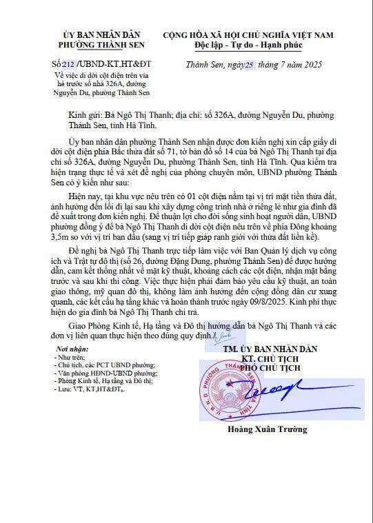 Trả lời đơn kiến nghị của bà Ngô Thị ThanhẨn danh25/07/2025A -A+Ẩn danh25/07/2025A -A+File đính kèm23.7.2025-Vv-di-doi-cot-dien-TDPTrungLan-ThachQuy(25.07.2025_16h55p45)_signed.pdf