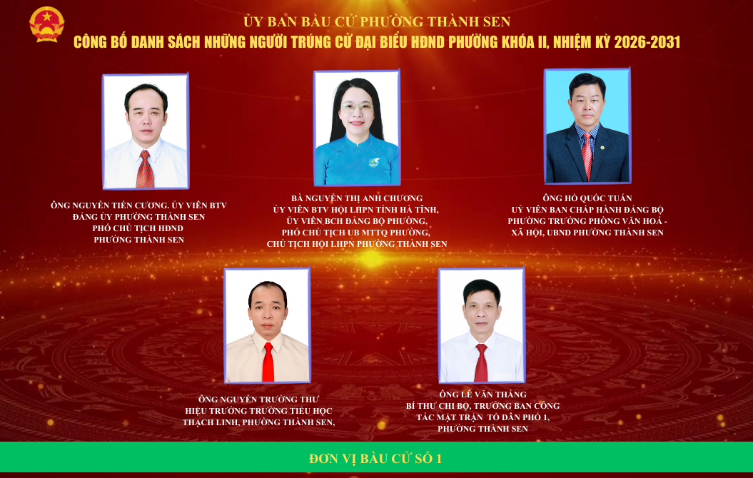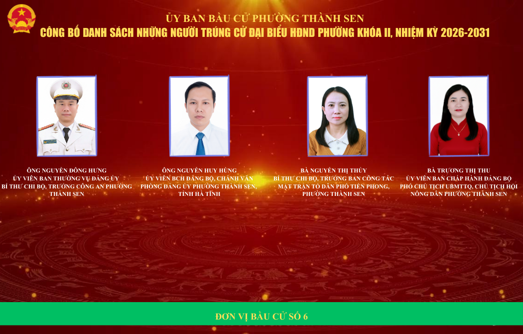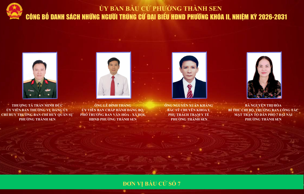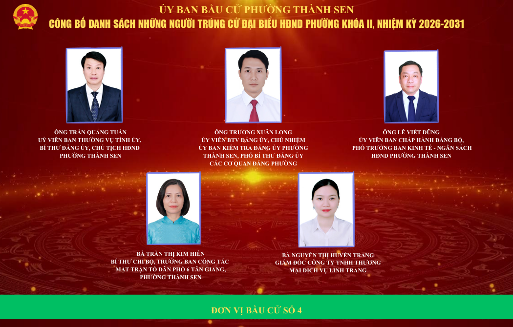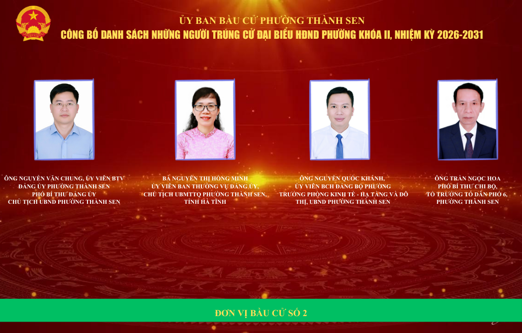 Ngày 18/3/2026, Ủy ban bầu cử phường Thành Sen ban hành Nghị quyết số 05/NQ-UBBC về công bố kết quả và danh sách những người trúng cử đại biểu HĐND phường khóa II, nhiệm kỳ 2026-2031.