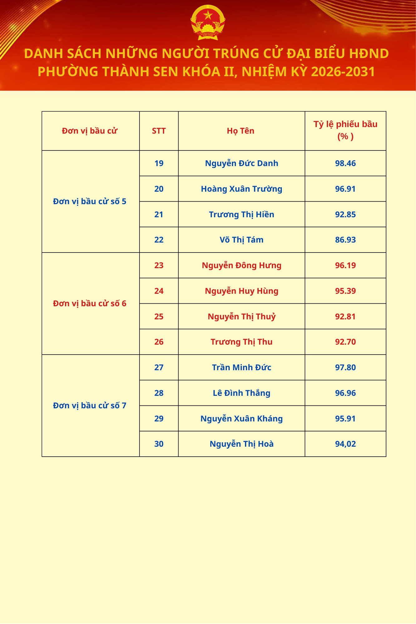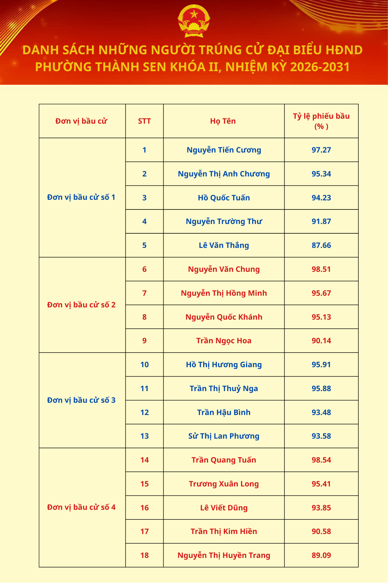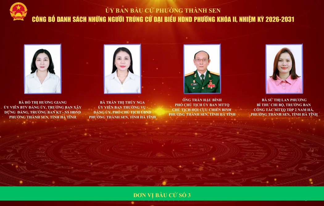 Ngày 18/3/2026, Ủy ban bầu cử phường Thành Sen ban hành Nghị quyết số 05/NQ-UBBC về công bố kết quả và danh sách những người trúng cử đại biểu HĐND phường khóa II, nhiệm kỳ 2026-2031.
